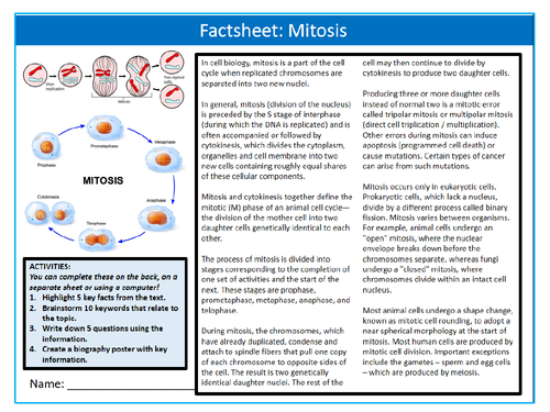 Mitosis Factsheet Worksheet Keywords Settler Starter Cover Lesson Science Biology Cell Division Teaching Resources