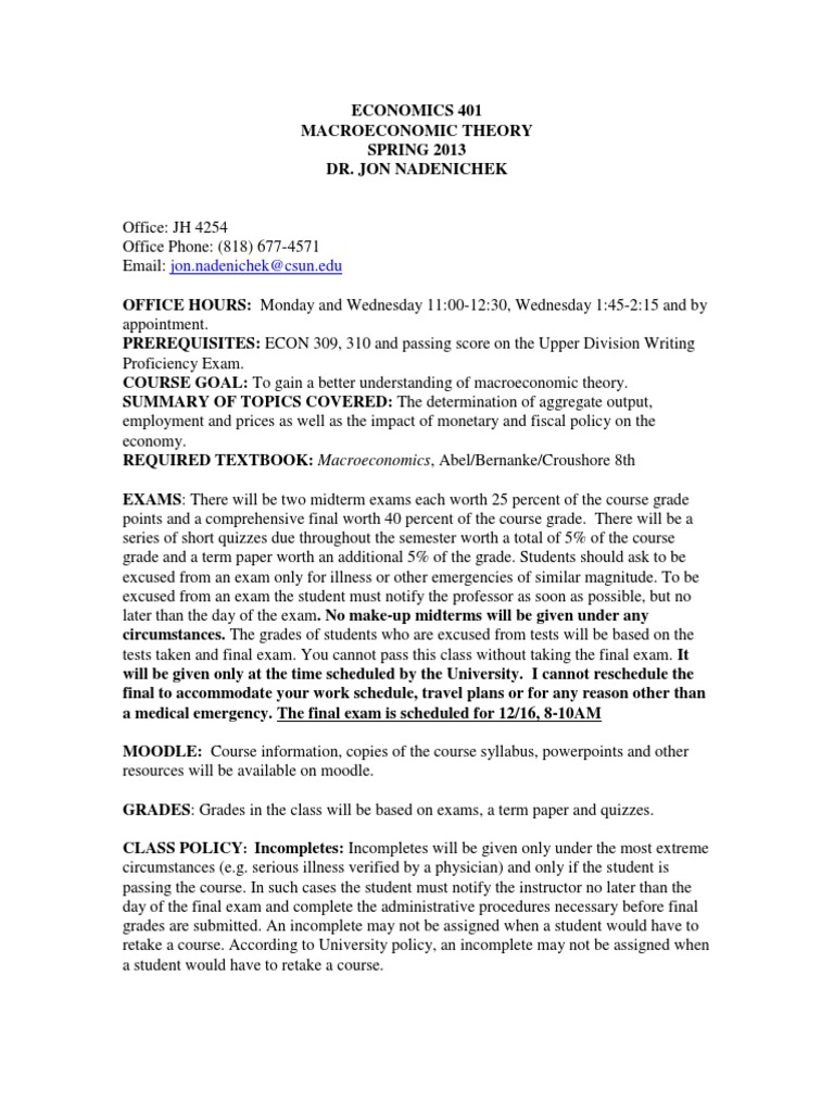 Economics 401 Syllabus Fall 2013 1 Test Assessment Macroeconomics
